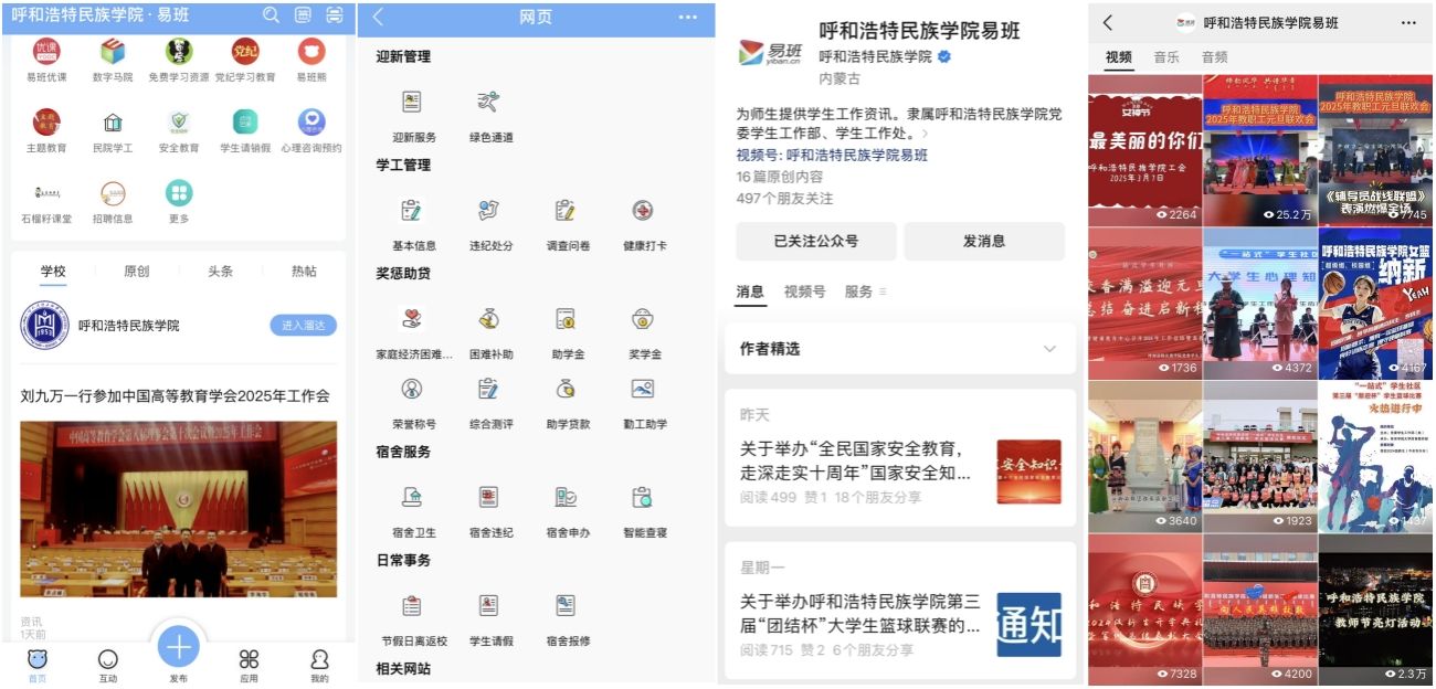 六年來,我校易班發(fā)展中心積極推進(jìn)落實(shí)《教育部等八部門關(guān)于加快構(gòu)建高校思想政治工作體系的意見》,堅(jiān)持以學(xué)生為中心,強(qiáng)化數(shù)字賦能,充分發(fā)揮易班平臺(tái)的思想政治教育功能。在易班app內(nèi)開發(fā)使用了“民院學(xué)工”系統(tǒng)(共21項(xiàng)應(yīng)用功能:學(xué)生基本信息、迎新服務(wù)、綜合測(cè)評(píng)、家庭經(jīng)濟(jì)情況認(rèn)定、獎(jiǎng)學(xué)金、助學(xué)金、困難補(bǔ)助、綠色通道、助學(xué)貸款、勤工助學(xué)、榮譽(yù)稱號(hào)、問卷調(diào)查、健康打卡、違紀(jì)處分、宿舍申辦、宿舍衛(wèi)生、宿舍報(bào)修、智能查寢、宿舍違紀(jì)、學(xué)生請(qǐng)銷假、節(jié)假日離返校)和《“互聯(lián)網(wǎng)+”大學(xué)安全教育》系統(tǒng)(內(nèi)設(shè)7大板塊34個(gè)單元700+門微課)。充分對(duì)接學(xué)校與大學(xué)生學(xué)習(xí)生活密切相關(guān)的校園服務(wù)工作,使易班成為“一站式”師生服務(wù)平臺(tái);另外,依托易班平臺(tái)以每月一主題的形式開展校園文化活動(dòng)。引導(dǎo)學(xué)生自覺遵守校規(guī)校紀(jì),塑造積極人格,養(yǎng)成良好習(xí)慣。同時(shí)建立“呼和浩特民族學(xué)院易班”官方微信公眾號(hào)、視頻號(hào),發(fā)布宣傳推文共505篇,平均閱讀量7000余次。發(fā)布剪輯短視頻67個(gè),總共預(yù)覽量69.1萬余次。