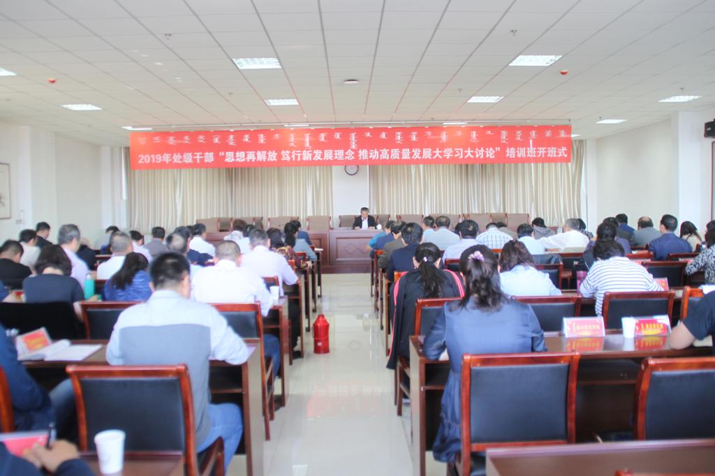 5月21日下午,學校2019年處級干部“思想再解放,篤行新發展理念,推動高質量發展大學習大討論”培訓班在綜合樓12樓會議室開班。黨委副書記胡春梅作動員講話,黨委副書記、校長格日樂圖為全體處級干部上了開班第一課。黨委委員、組織部部長吳阿古拉主持開班儀式,全校處級以上干部參加。