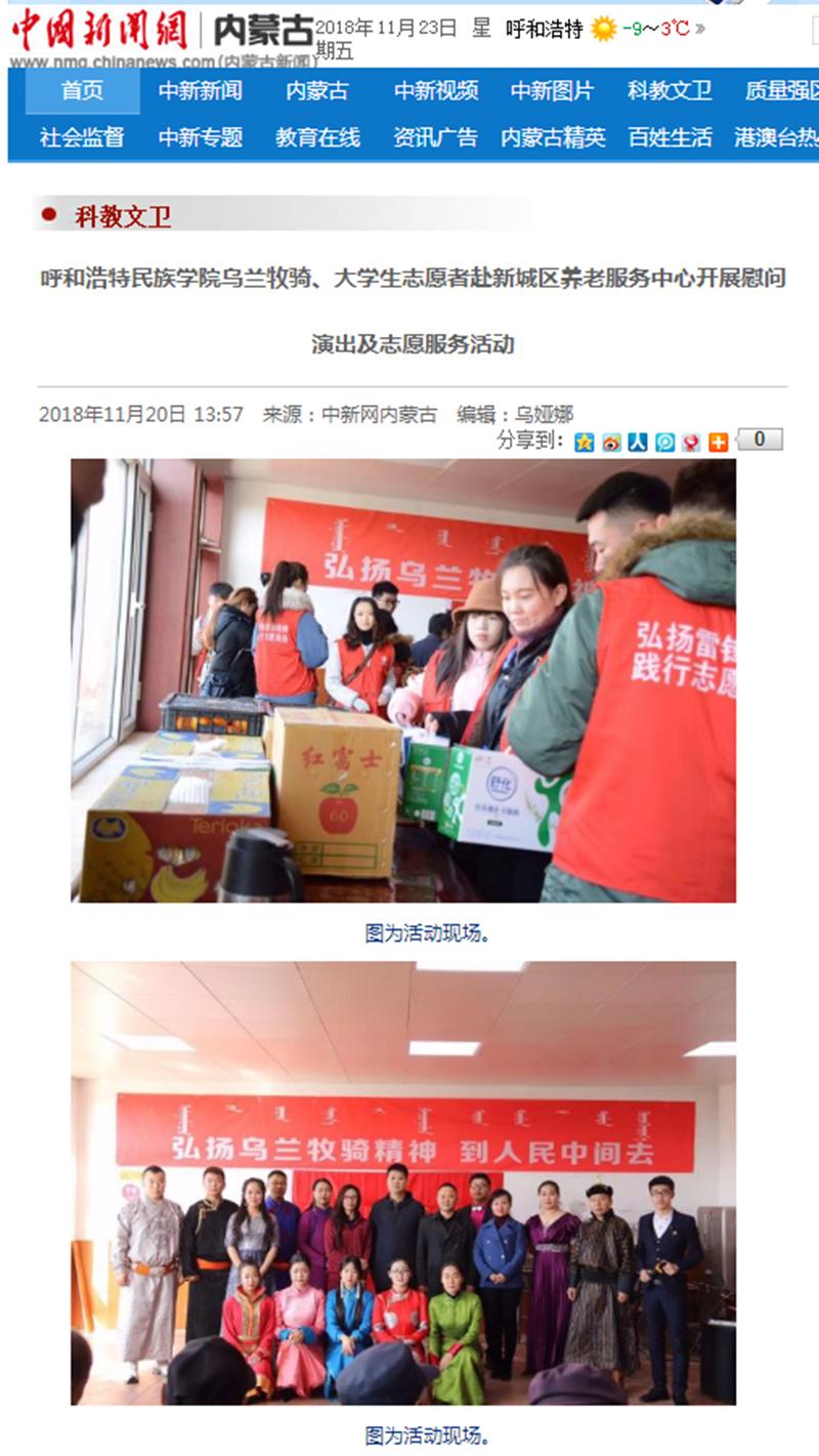 近日,中國新聞網、呼和浩特新聞網、大學生手機報先后報道我校烏蘭牧騎隊員和大學生志愿者組成小分隊赴新城區養老服務中心開展的慰問演出及志愿服務活動。我校烏蘭牧騎自成立以來,陸續開展了7場演出活動,得到了區內外媒體的廣泛關注,這不僅是我校烏蘭牧騎的光榮,也提高了學校的美譽度。