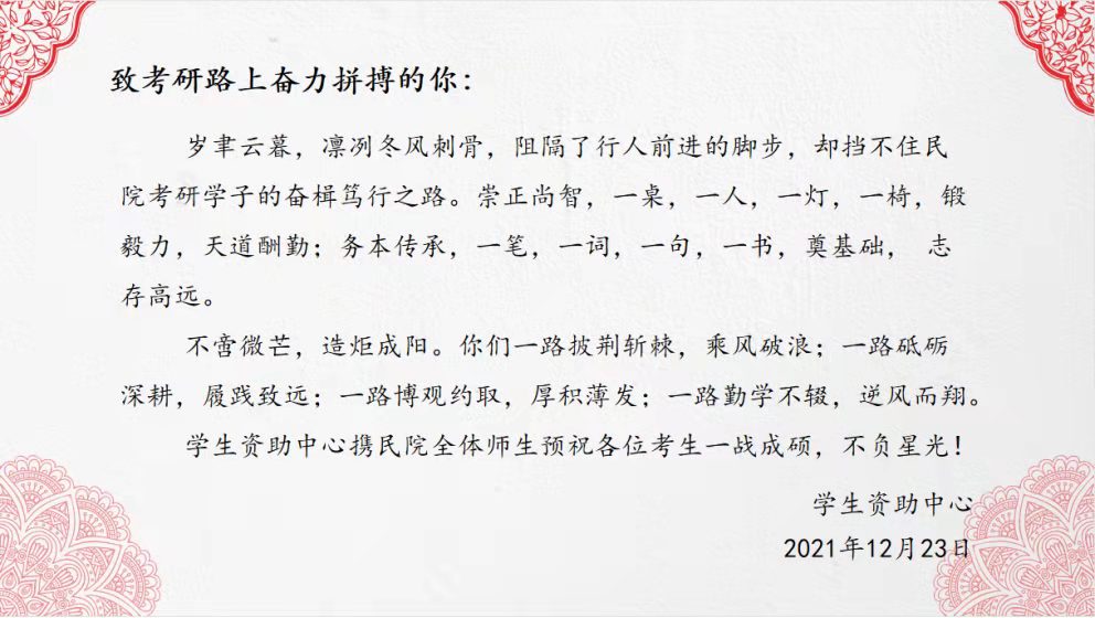 今年,在常態化疫情防控下,考研學子面臨著更加嚴峻的形勢和挑戰。學生資助中心始終堅持切實滿足學生個性化資助需求,把握住考研這一關鍵資助節點,確保學生無憂考研、安心考研,讓寒門學子敢于有夢、勇于追夢,持續開展有溫度、有精度、有深度的資助關懷,全面助力考研學子逐夢啟航。