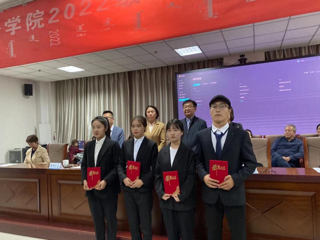 大會在莊嚴(yán)的國歌聲中拉開帷幕。首先,肖查娜院長對全體2022級新生的到來表示熱烈的歡迎,并詳細(xì)介紹了外國語學(xué)院辦學(xué)基本情況及發(fā)展現(xiàn)狀,并逐一向新生介紹各位老師。肖院長寄語2022級新生,希望他們珍惜寶貴的學(xué)習(xí)機(jī)會,未雨綢繆、虛心向?qū)W、會通中外、見賢思齊、不負(fù)青春、早日成材。隨后,教師代表吳丹副教授、在校生代表2019級小學(xué)教育(英語方向)三班馬璐、新生代表2022級日語班云靜分別發(fā)言,我院優(yōu)秀畢業(yè)生代表,現(xiàn)于中國傳媒大學(xué)攻讀碩士研究生的娜仁通力嘎同學(xué)以視頻形式和新生分享了心得感悟。黨總支副書記紅梅宣讀《外國語學(xué)院關(guān)于表彰2022級新生軍事技能訓(xùn)練優(yōu)秀標(biāo)兵和優(yōu)秀學(xué)生干部的表彰決定》,并由與會老師為獲獎學(xué)生頒發(fā)榮譽(yù)證書。