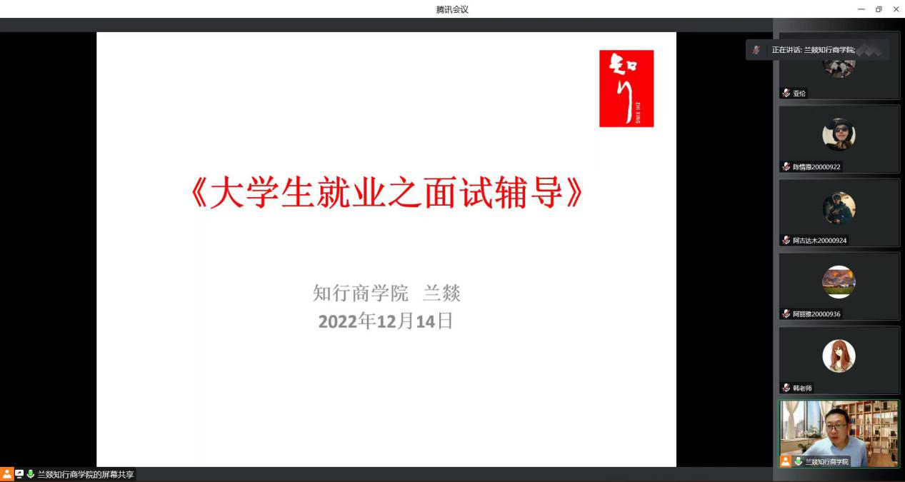 為進(jìn)一步做好2023屆畢業(yè)生就業(yè)指導(dǎo)工作,引導(dǎo)畢業(yè)生樹立正確的就業(yè)觀念。12月14日晚,馬克思主義學(xué)院邀請內(nèi)蒙古知行職業(yè)培訓(xùn)學(xué)校校長、人力資源管理專家、立人人才集團(tuán)咨詢顧問蘭燚講師,做《大學(xué)生就業(yè)面試輔導(dǎo)》專題講座。講座由馬克思主義學(xué)院黨總支副書記韓瓊主持,2023屆全體畢業(yè)生參加了講座。