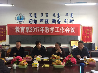 12月28日上午9時,教育系在系資料室召開了2017年教學工作會議。會議由教育系黨總支書記王福清主持,學校教務處副處長胡畢斯哈拉圖、督導組組長金鎖、教育系系主任劉根歲、教師和學生代表參加會議。