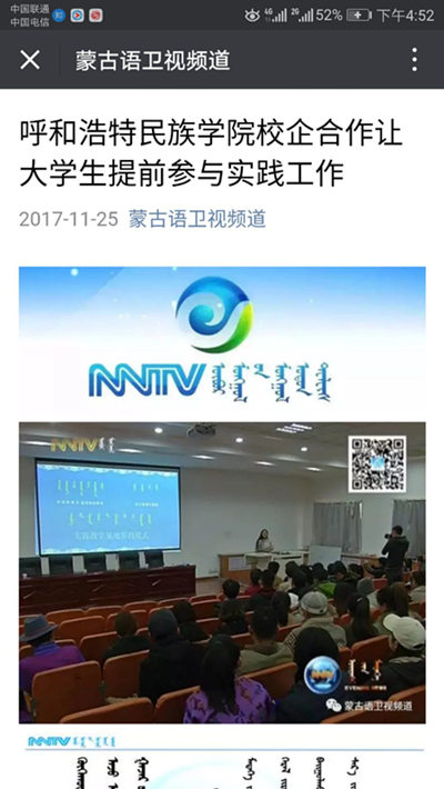本次合作對傳媒系推進教學改革,深化校企合作,提升民族文化產(chǎn)業(yè)服務能力等方面具有著積極的意義。內(nèi)蒙古蒙古語衛(wèi)視、內(nèi)蒙古蒙古語廣播、內(nèi)蒙古日報社等媒體單位對此次掛牌簽約儀式進行了全程報道。