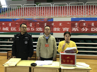 11月8日12時許,新城區第十七屆人大代表選舉于呼和浩特民族學院隆重舉行,在新城區第65選區教育系分區投票站內,教育系師生共計455名選民進行了選舉。