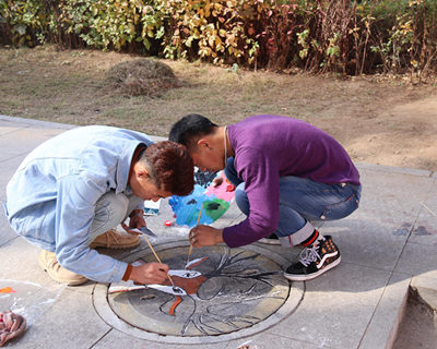 為豐富大學生課余文化生活,以生動活潑的藝術氣息營造校園氛圍,展示當代大學生的個性風采,以朝氣蓬勃的精神風貌迎接黨的十九大勝利召開,10月15日—17日,由美術系手繪社主辦,開展了“井上添彩”—愛護環境、創和諧校園井蓋手繪活動。