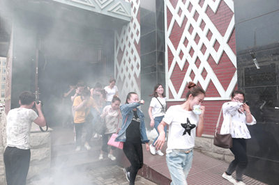 首先,保衛(wèi)處趙瑞俊老師詳細(xì)給學(xué)生們講解了基本消防知識(shí)和遇到火災(zāi)時(shí)的逃生知識(shí)。接著,模擬情景為近200名傳媒系師生正在演播廳組織活動(dòng),突然有老師發(fā)現(xiàn)濃煙四起,疑似火災(zāi)發(fā)生,老師立刻組織學(xué)生緊急疏散,大家用濕毛巾捂住口鼻有序撤離。最后,全體師生從演播廳內(nèi)疏散后由班長(zhǎng)清點(diǎn)上報(bào)人數(shù),并以班級(jí)為單位在籃球場(chǎng)內(nèi)整隊(duì)集結(jié)。