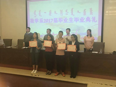 2017年6月23日晚,數學系2017屆畢業生畢業典禮在圖書館一樓報告廳隆重舉行。數學系黨總支書記布日古德、系主任額爾敦布和教授、副主任王海清副教授,以及教師代表、全體畢業生和非畢業班學生代表參加了本次典禮。典禮由系黨總支書記布日古德主持。