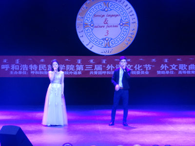 呼和浩特民族學院第三屆“外語文化節”外文歌曲演唱大賽于2017年6月21日晚在學校演播廳拉開帷幕。本次大賽由高等教育出版社獨家贊助,比賽特邀紅梅老師、王春梅老師、烏吉斯古冷老師、高烏蘭老師擔任評委。