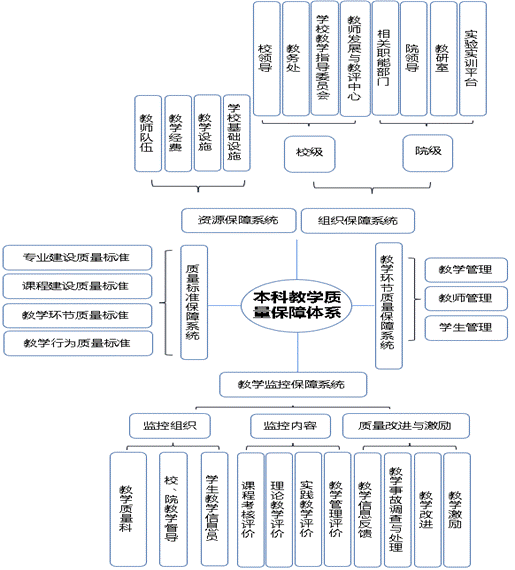1.學校領導注意力在本科聚焦。校黨委專題研究馬克思主義學院標準化建設工作,黨委書記指出“要提高政治站位抓發展、要對標對表抓發展、要展望未來抓發展”的要求,積極推進馬克思主義學院高質量發展;在學校第五屆教職工代表大會暨工會會員代表大會2022年年會上校長做《砥礪奮進 開拓創新 推動學校事業高質量發展》的大會報告,提出“加強思想政治教育、推進專業轉型升級、深化教育教學改革”。2021-2022學年,學校召開院長、教學副院長工作會議21次、本科教學督導方面的調度會16次。學校以人才培養目標的有效達成為導向,以優質的條件資源和完善的組織制度為保障,建立了由資源保障系統、組織保障系統、質量標準保障系統、教學 監控保障系統、教學環節質量保障系統組成的本科教學質量保障體系。(詳見圖1)。
